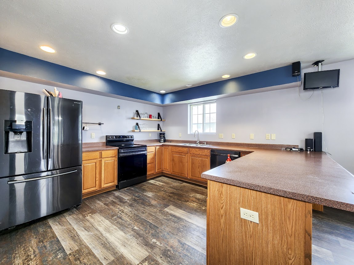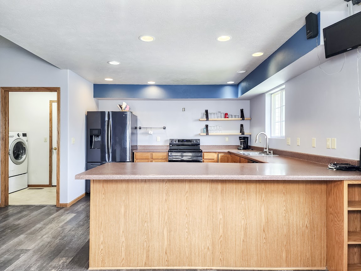 The kitchen stands out with its open shelving design, bringing both style and functionality to the space.